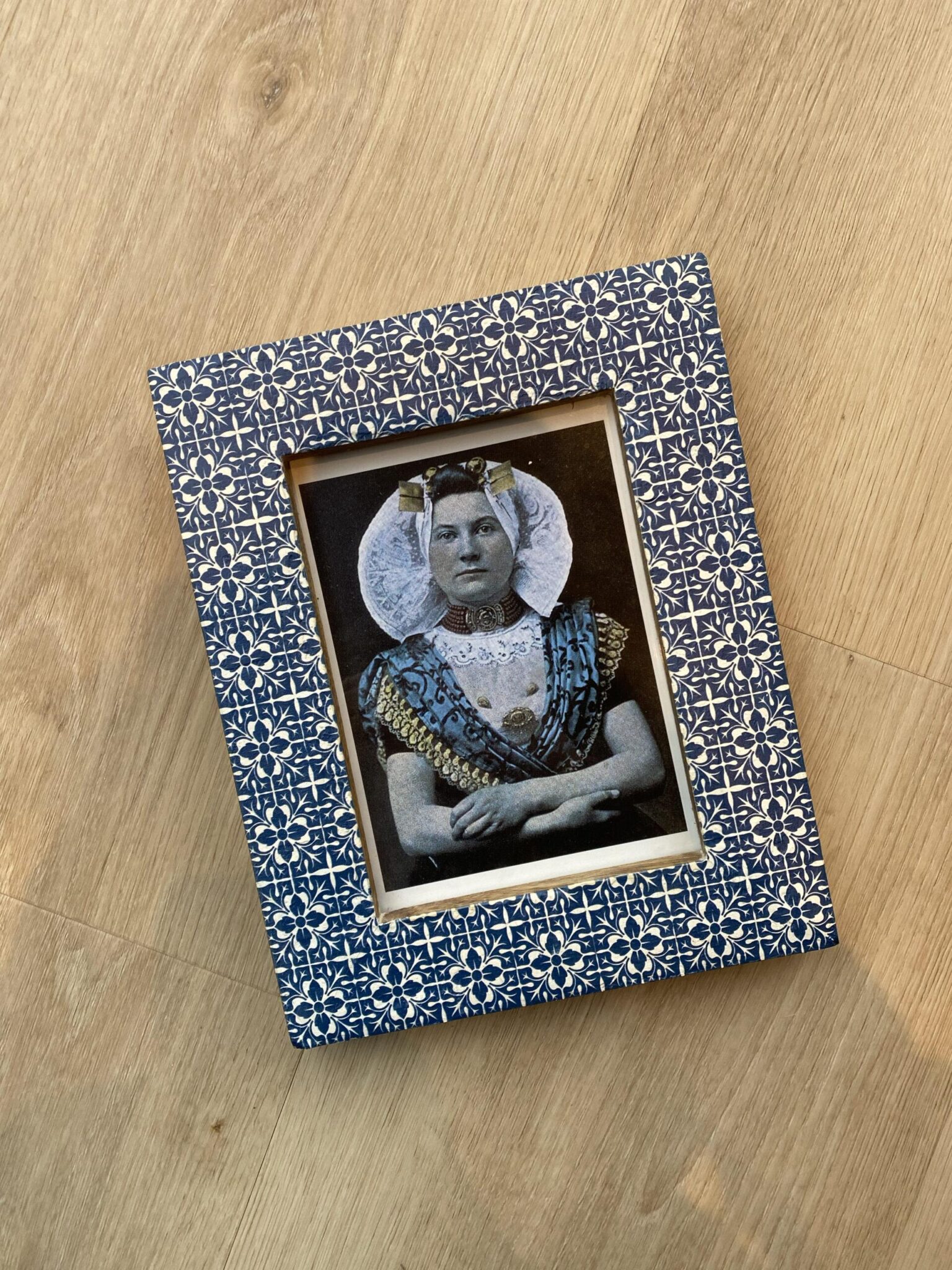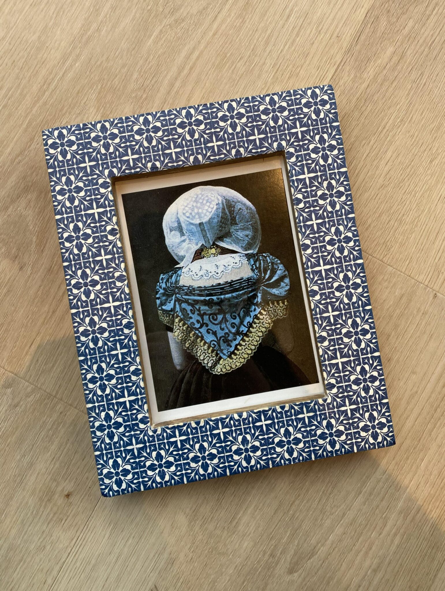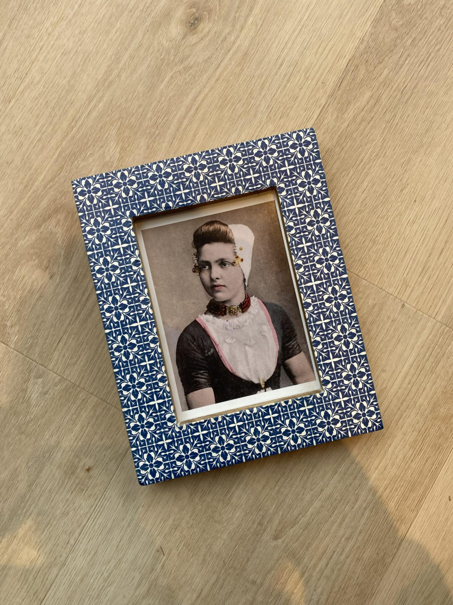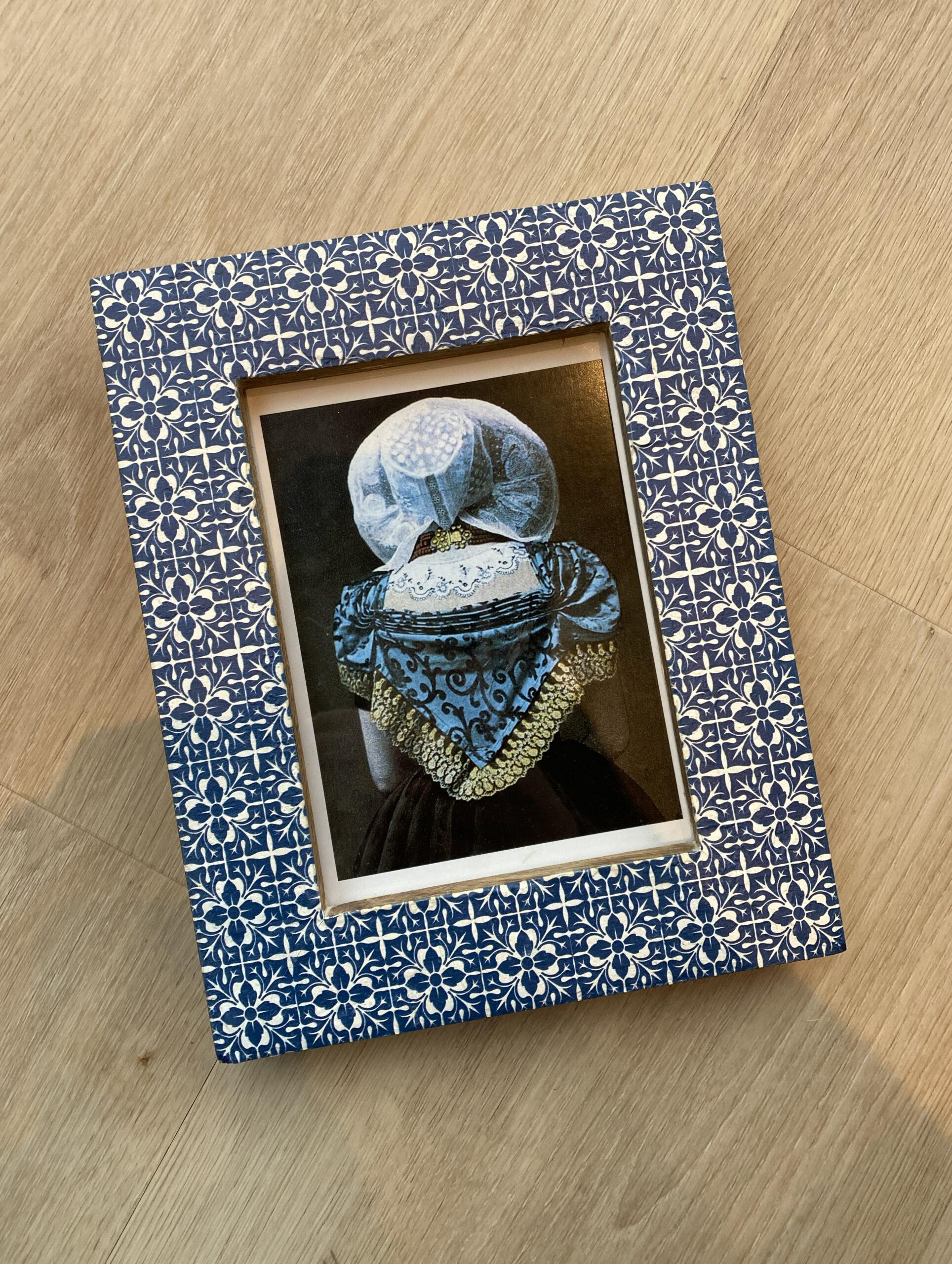 De lijst is afgewerkt met een verfijnd blauw-wit patroon dat naadloos past in zowel moderne als klassieke interieurs. Of u de fotolijst nu op een tafel, plank of als onderdeel van een galerijwand plaatst, dit decoratieve object voegt karakter en betekenis toe aan uw interieur.