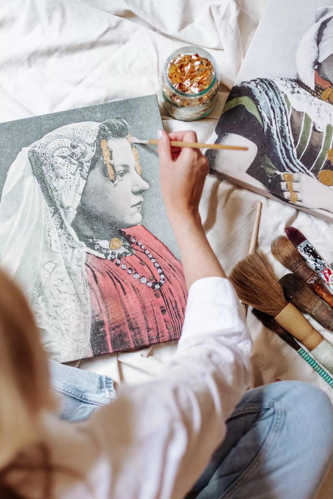 Een uniek portret van de streekdracht van Zeeland – Tholen / Schouwen-Duiveland, handgemaakt en bewerkt met bladgoud.